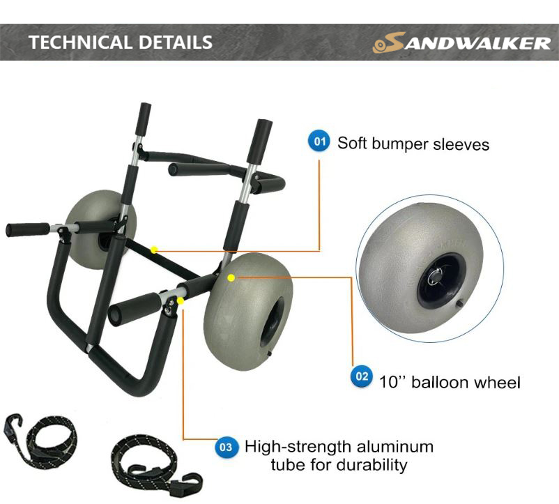 Este carrinho apresenta uma construção em alumínio resistente que oferece resistência e durabilidade, garantindo que ele possa suportar os elementos e terrenos agressivos que podem ser encontrados durante o transporte.